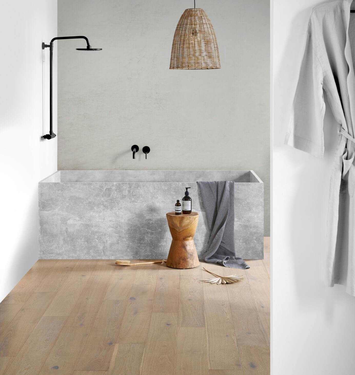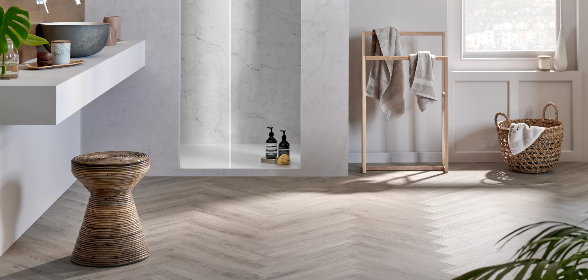 You can still have beautiful wood flooring in your bathroom with our 100% waterproof LVT Wood Design planks - no need to worry about water damage.